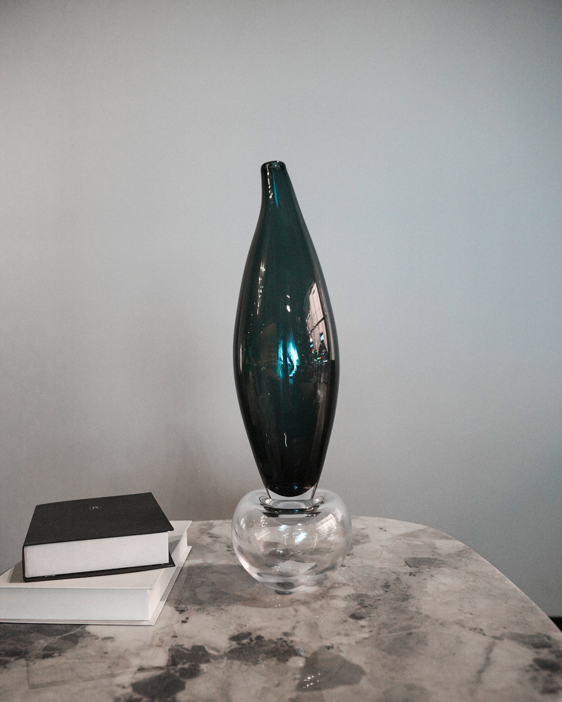 This hand-blown glass table lamp blends artisanal craftsmanship with elegant design, featuring a refined iron...