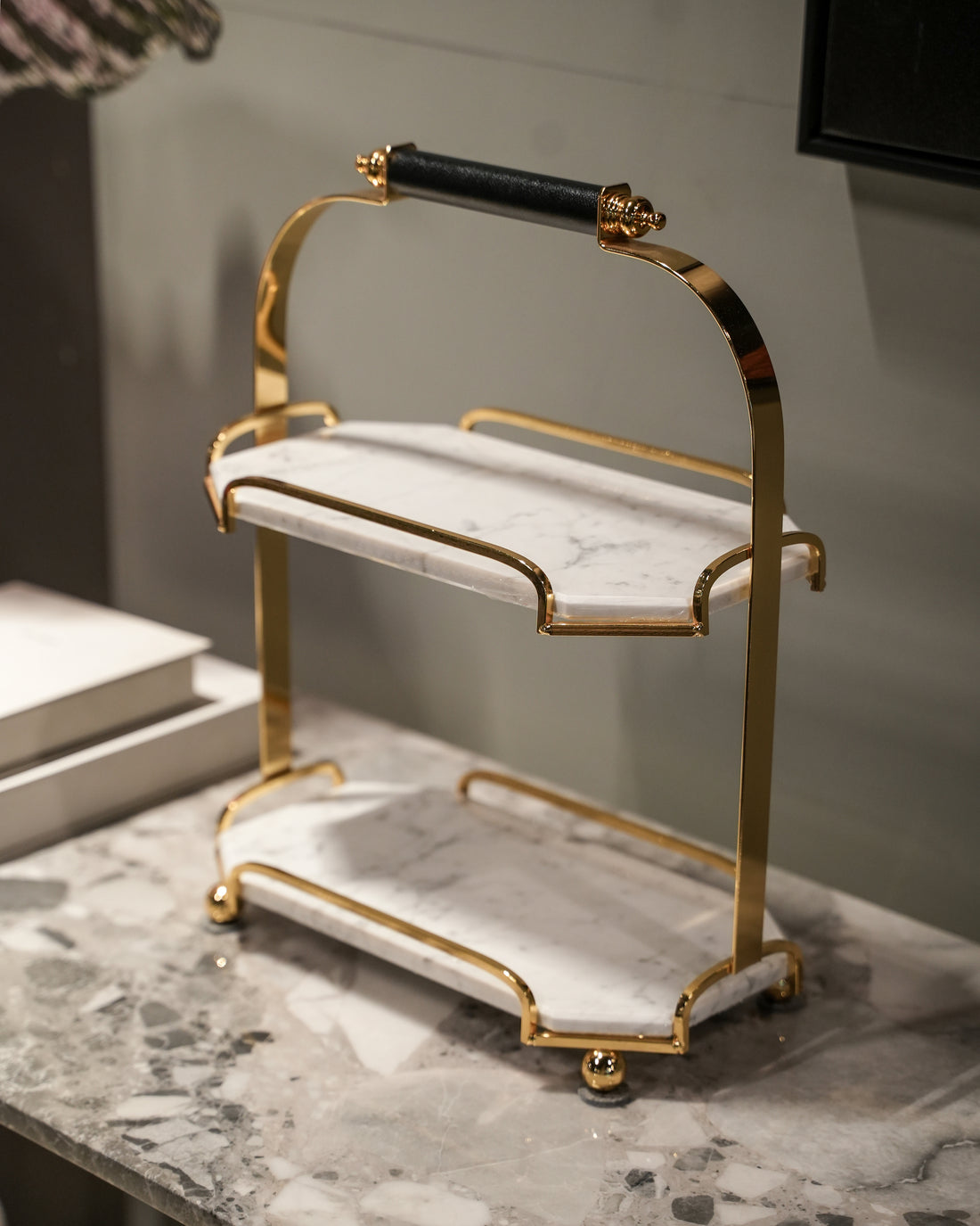 This small white marble décor piece showcases timeless elegance, beautifully enhanced by luxurious golden metal...