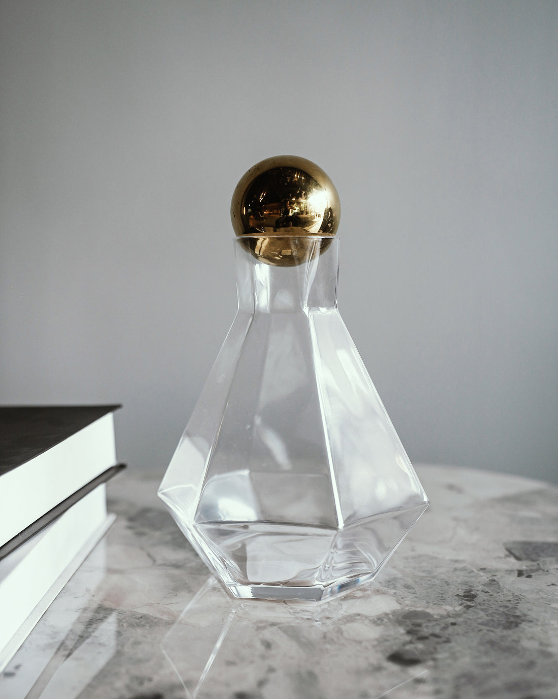 This decorative bottle pairs warm amber-brown glass with a sleek stainless steel sphere top for...