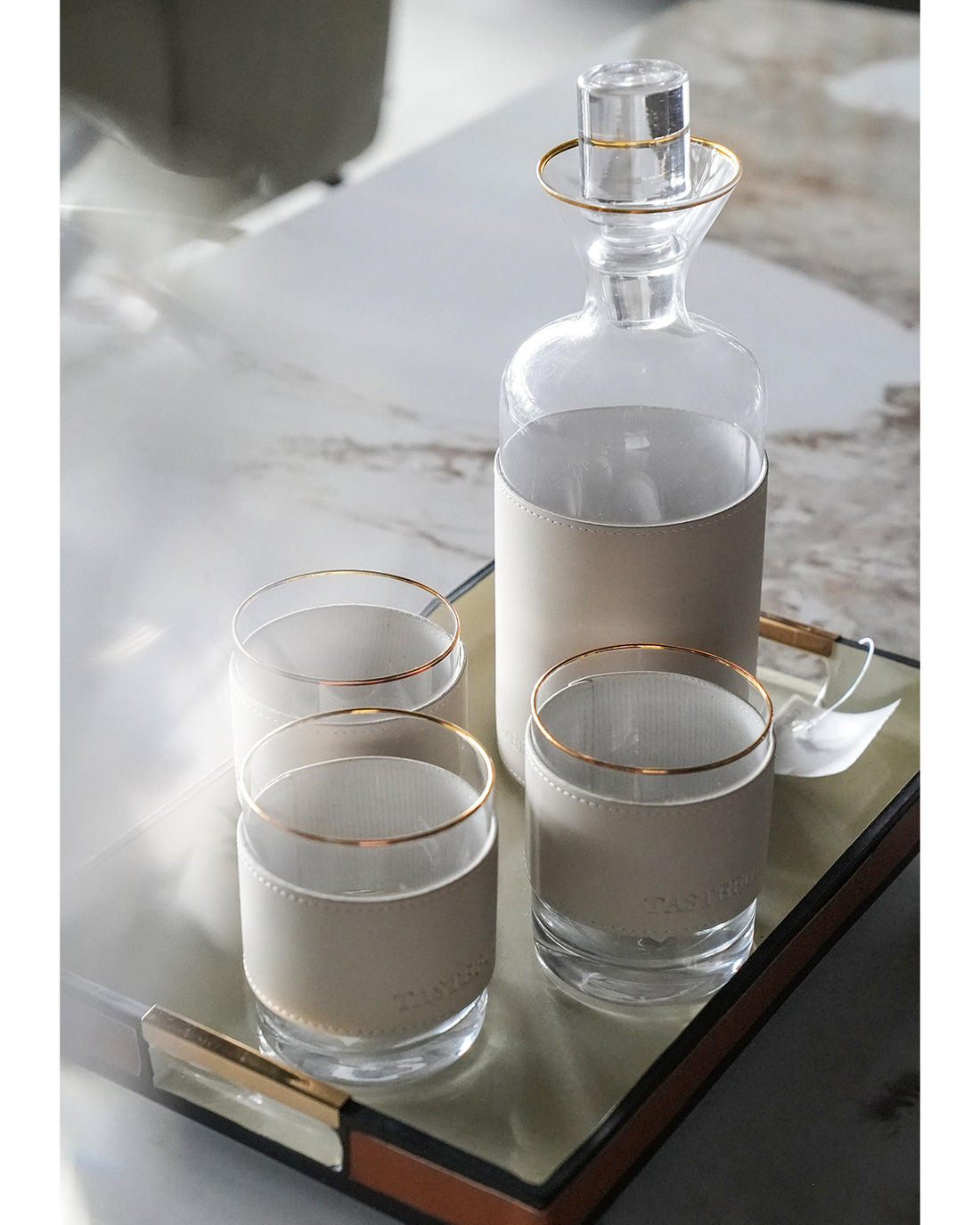 A glass with a leather covering features a sleek, protective wrap of leather around the...