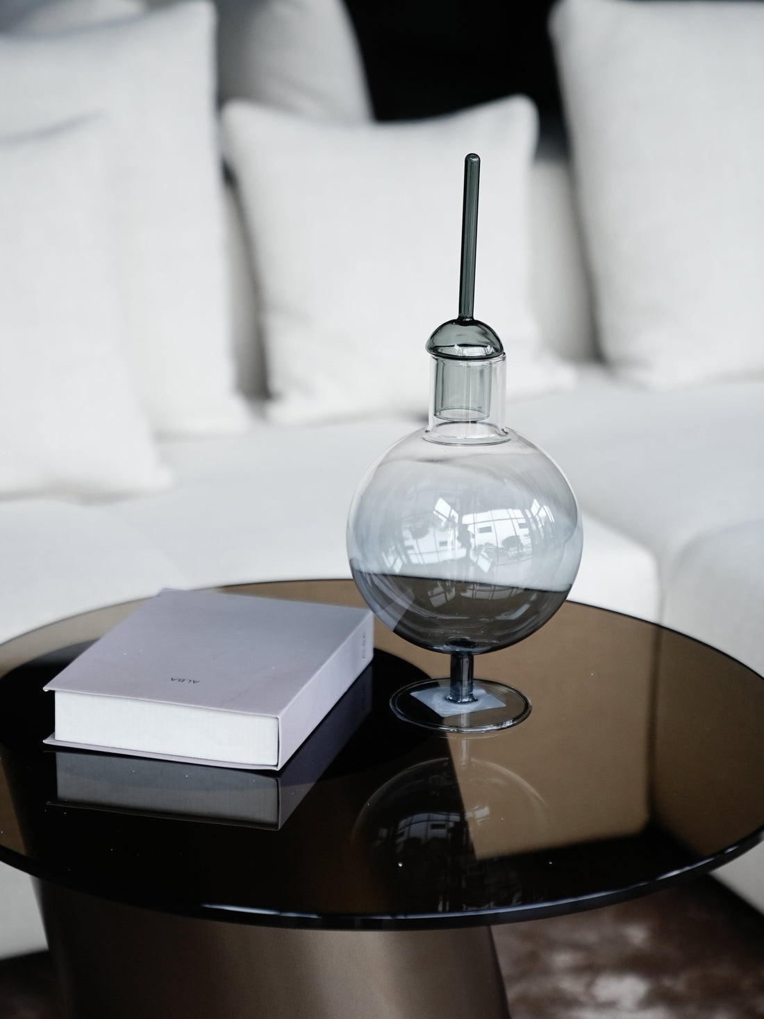 Crafted in smoky grey glass, this tall accent piece introduces refined texture and subtle color...