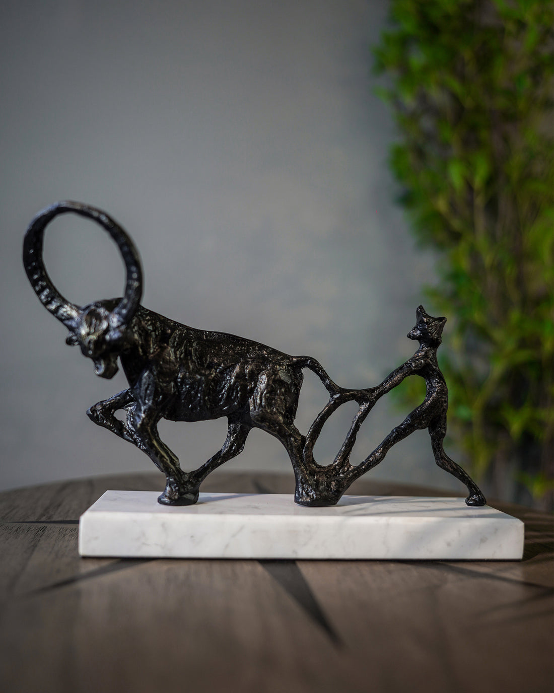 This dynamic sculpture showcases a striking interplay between a bull and a human figure, expertly...