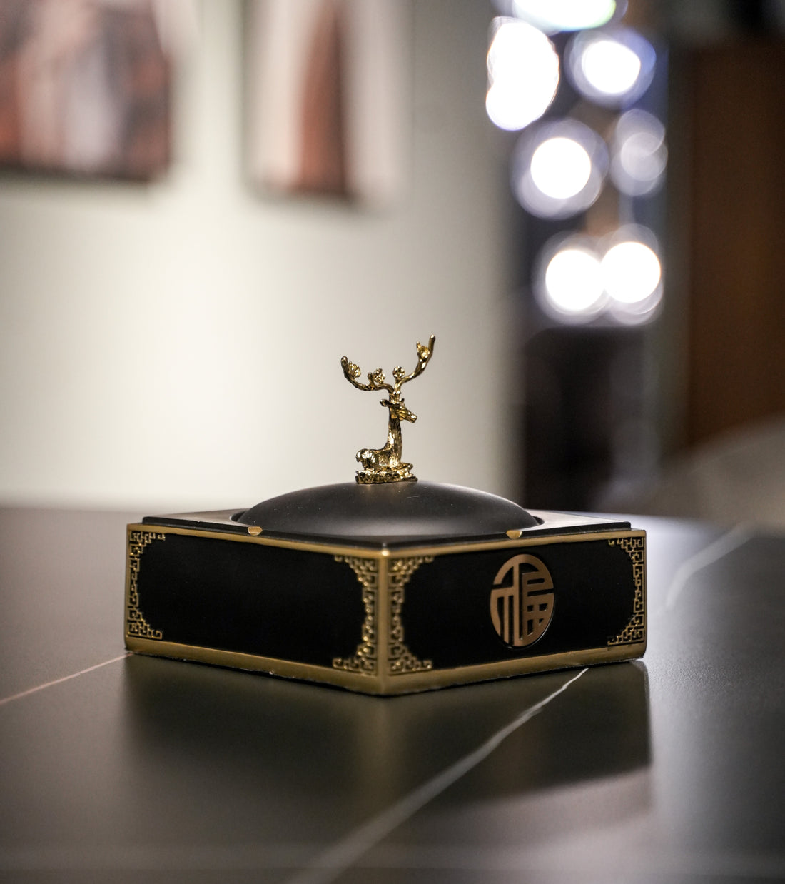 A sophisticated black resin-metal ashtray that combines durability with modern elegance, suitable for any setting....