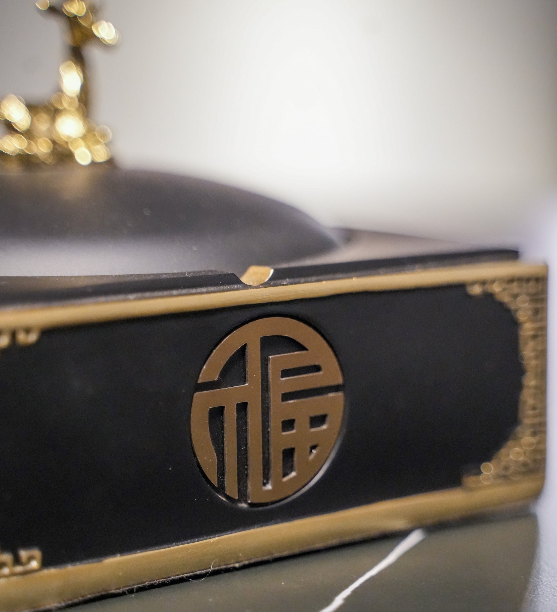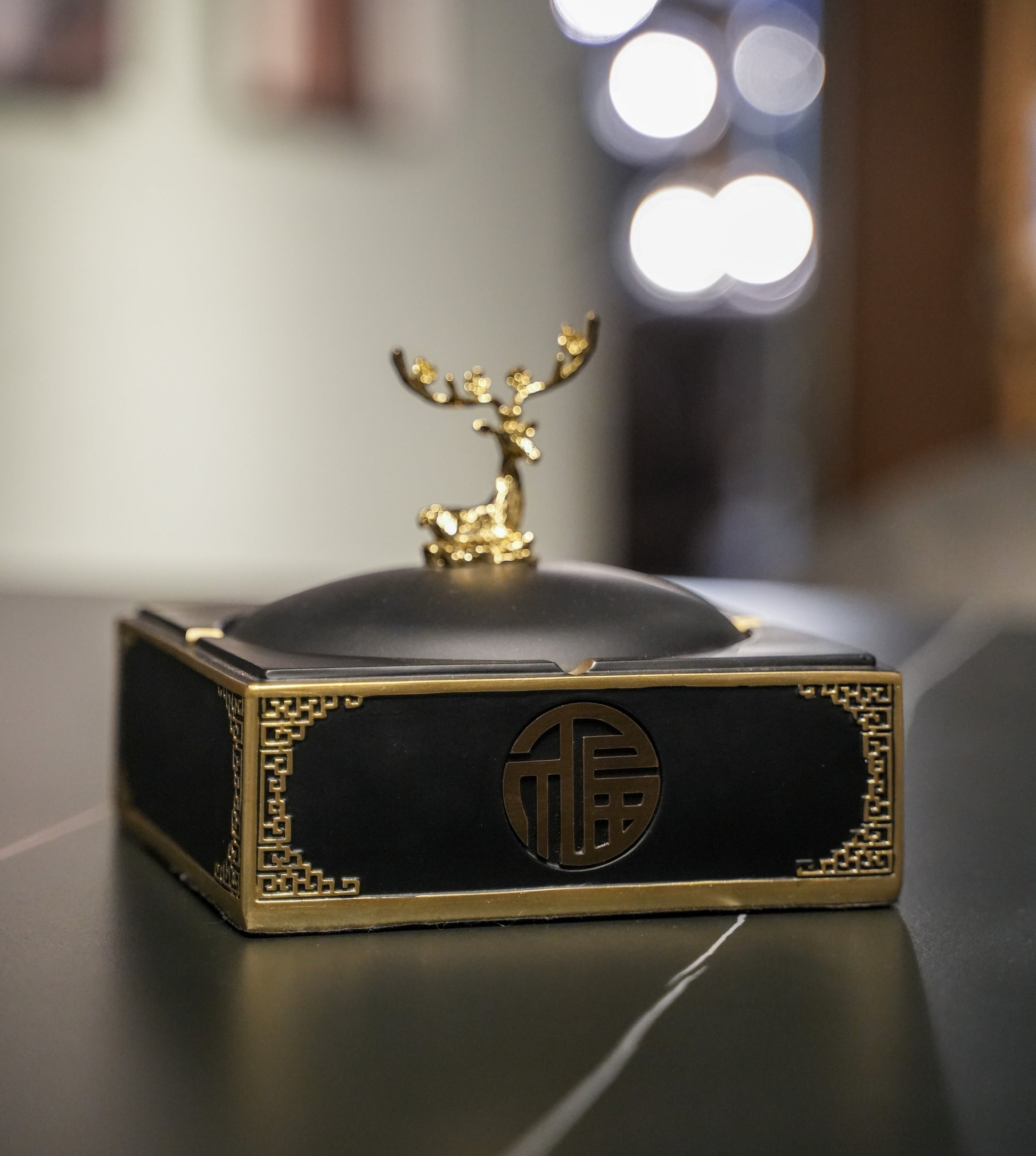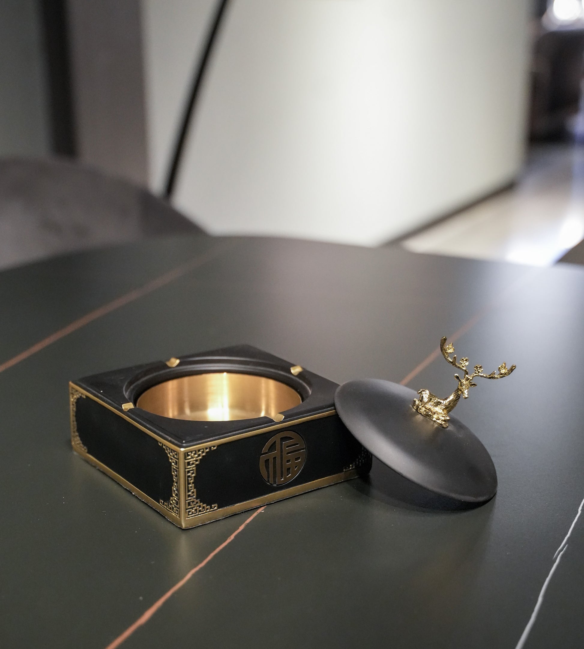 A sophisticated black resin-metal ashtray that combines durability with modern elegance, suitable for any setting.