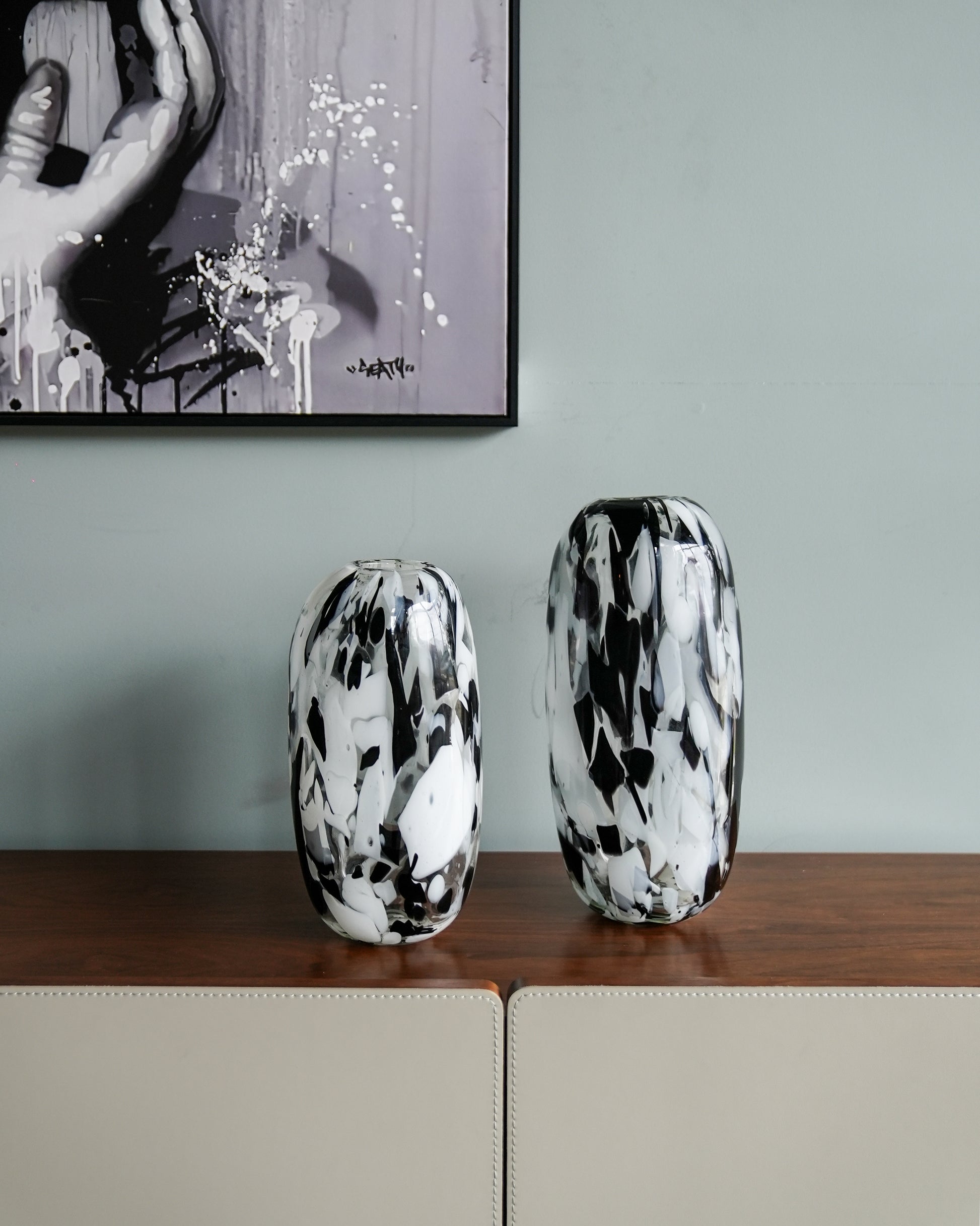 Elegant handcrafted black and white glass vase, ideal for modern decor and floral arrangements.