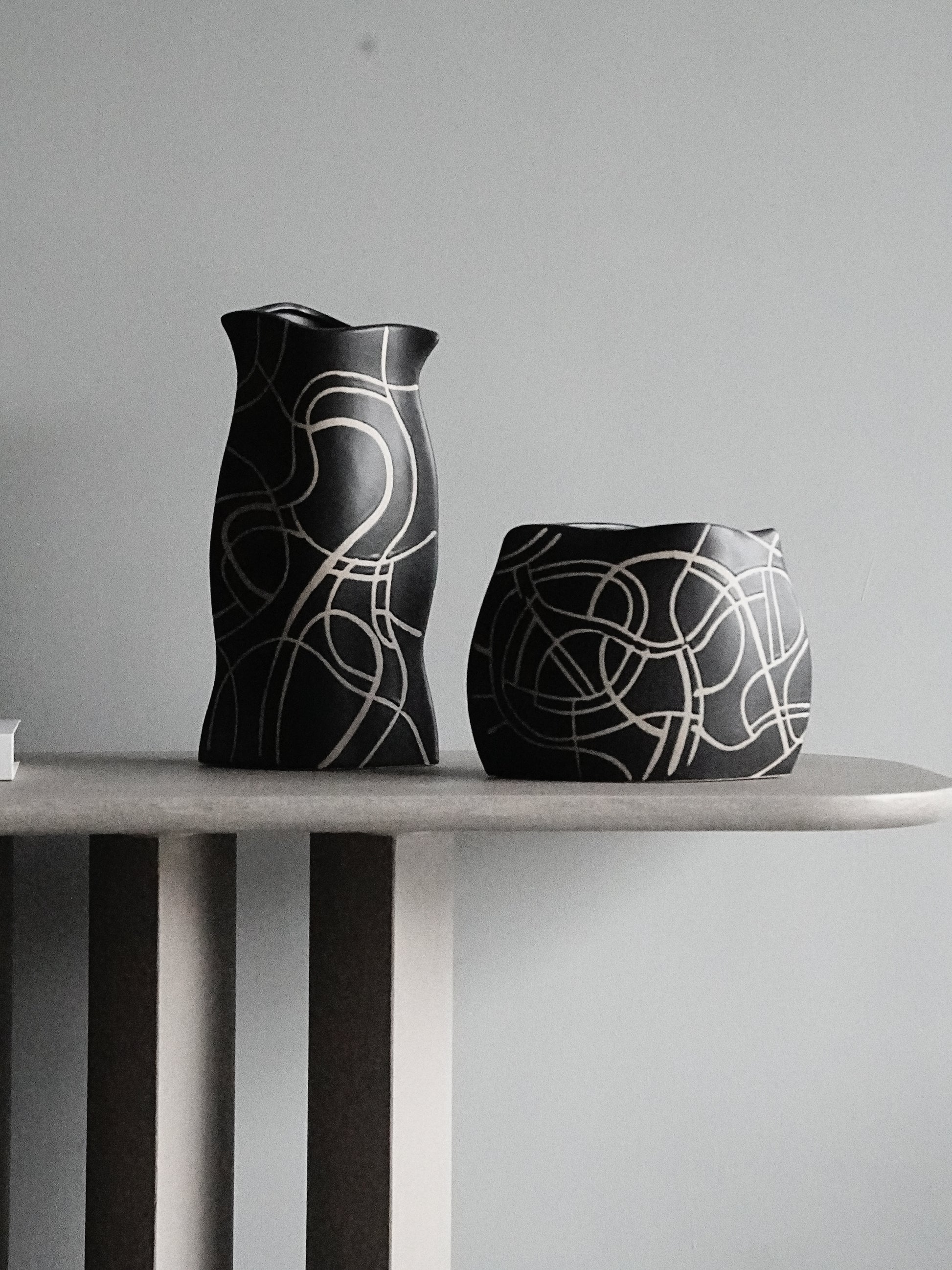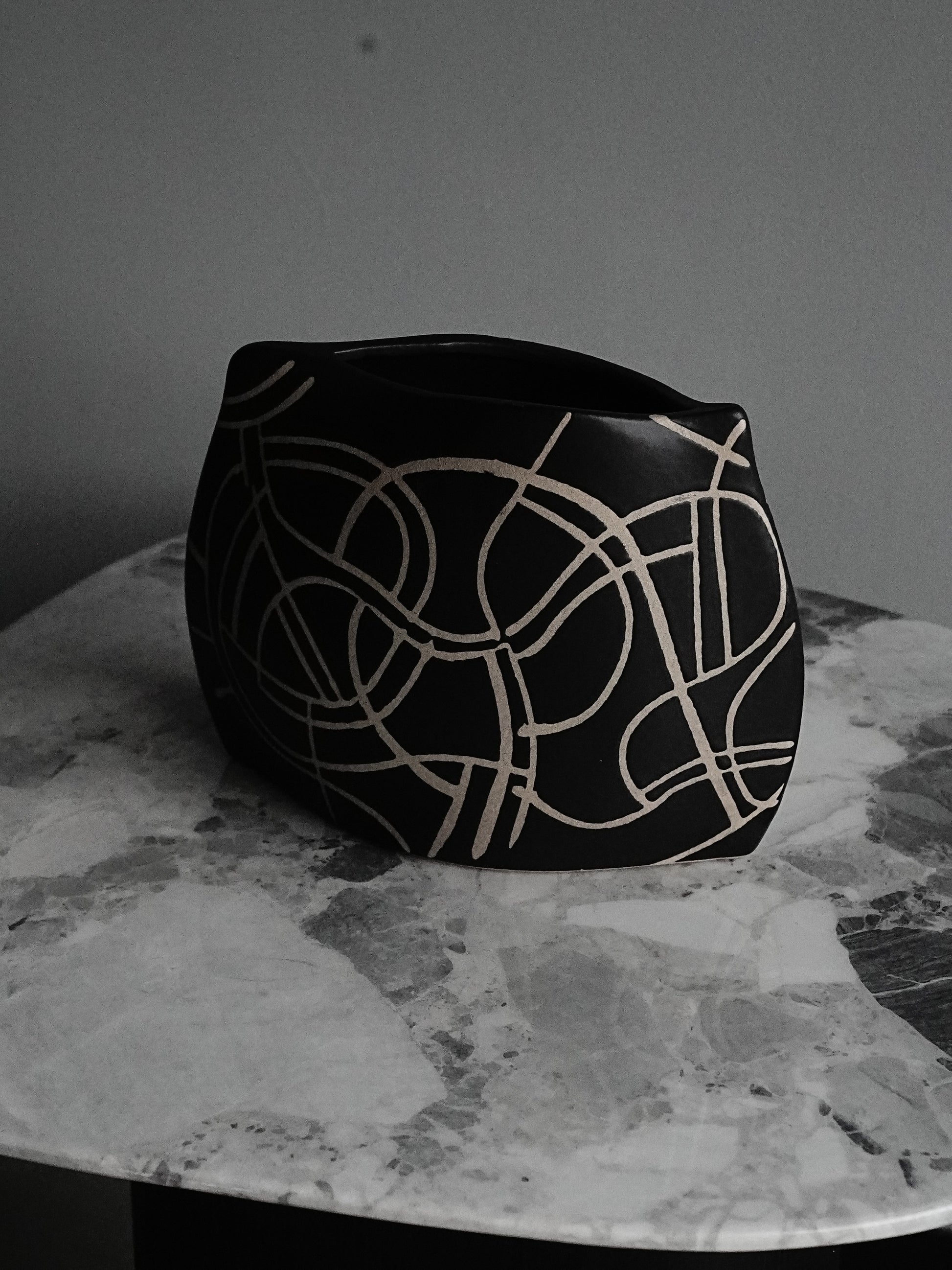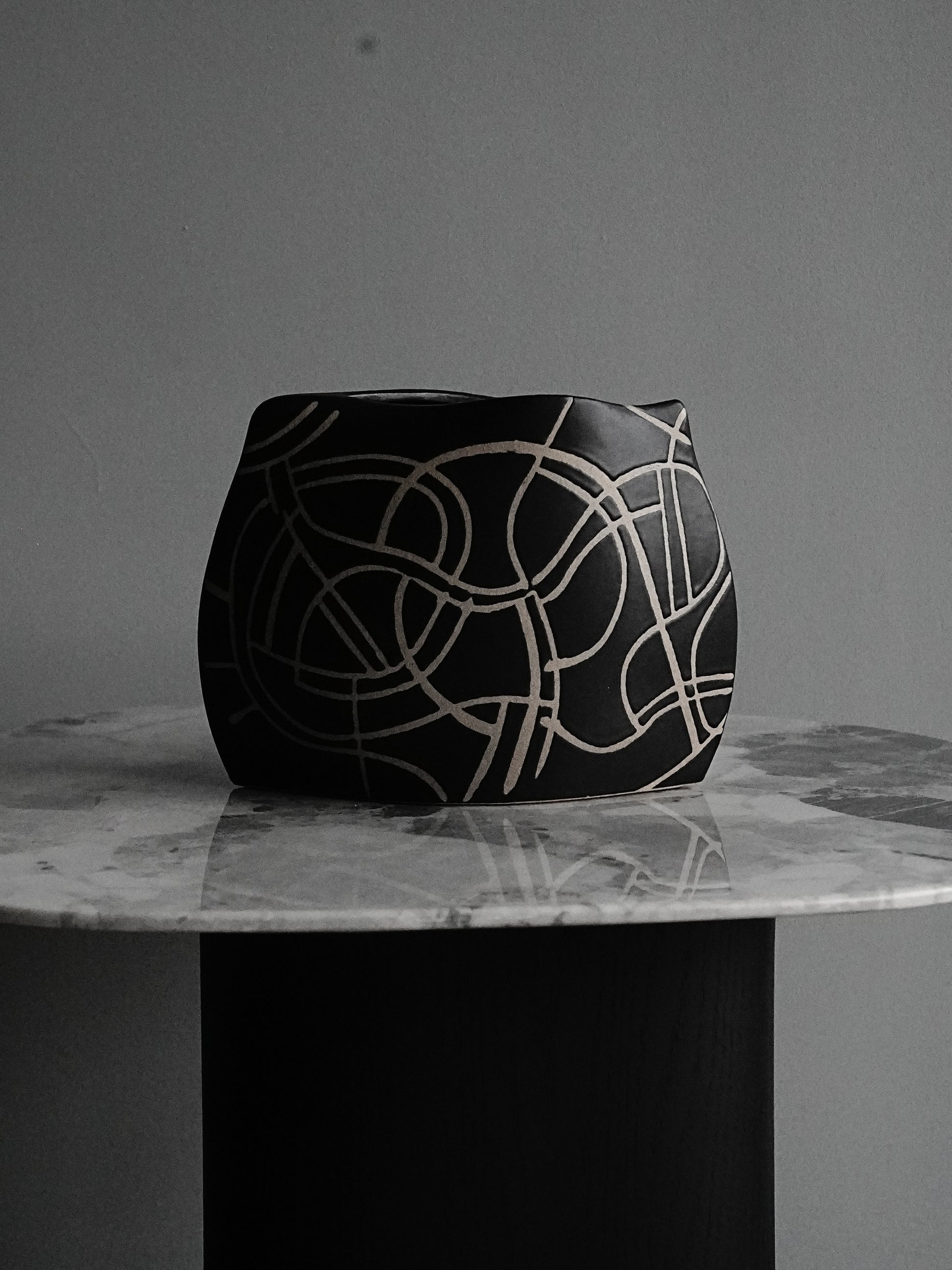 Enhance your decor with our small abstract flat ceramic vase, a striking artistic piece that adds a modern touch and is perfect for displaying delicate blooms or standing out on its own.