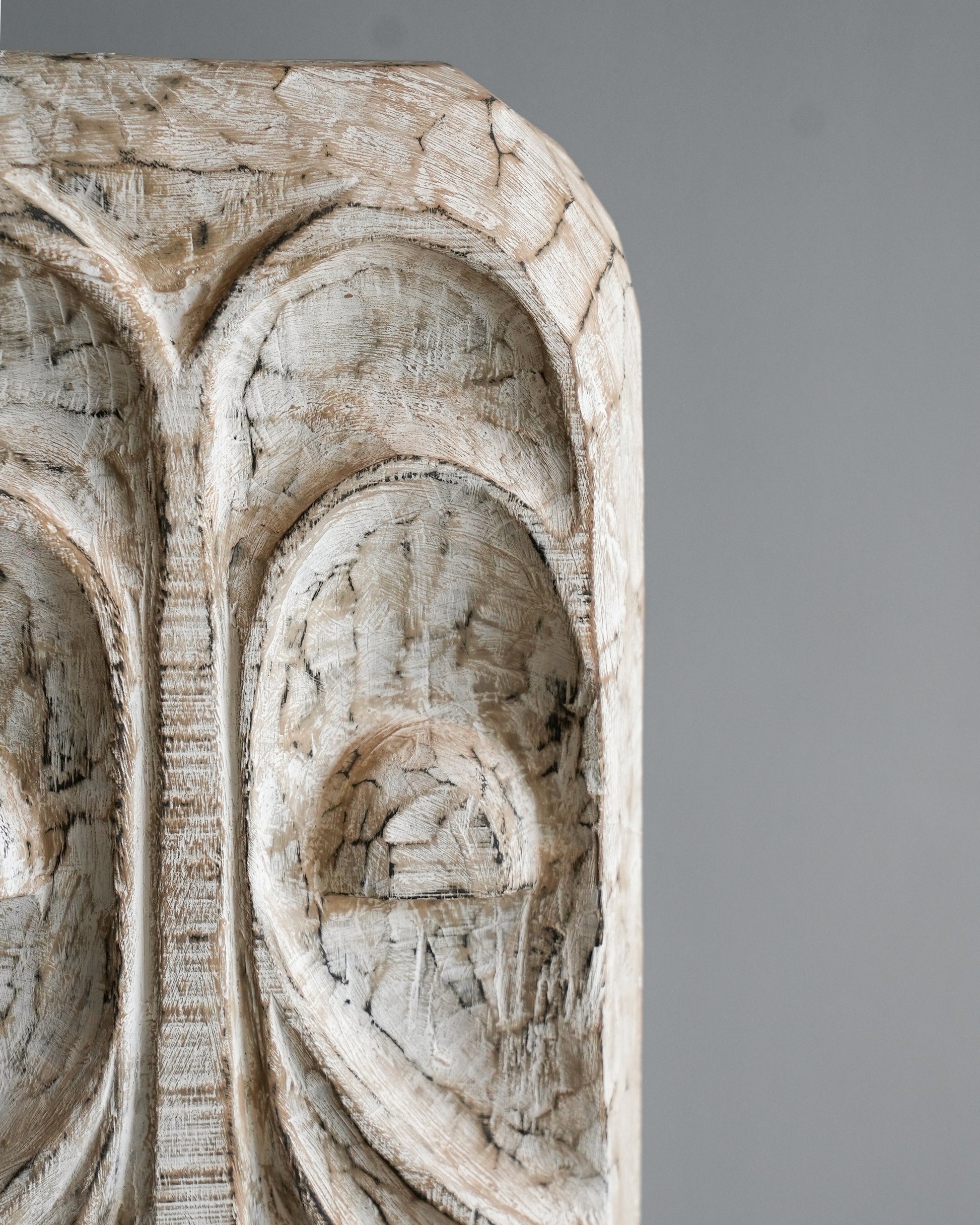 This striking wooden sculpture is hand-carved by Indonesian artisans, showcasing intricate tribal-inspired patterns and a distinctive face design. It’s a commanding piece that brings global artistry and natural texture to modern interiors. The weathered finish and detailed carvings give it a rustic, time-worn character, while the sturdy base ensures stability for floor or console display. Perfect for adding cultural depth and a sophisticated, organic touch to living rooms, entryways, or curated gallery-style spaces, it celebrates craftsmanship and storytelling from Indonesia’s rich artistic heritage.