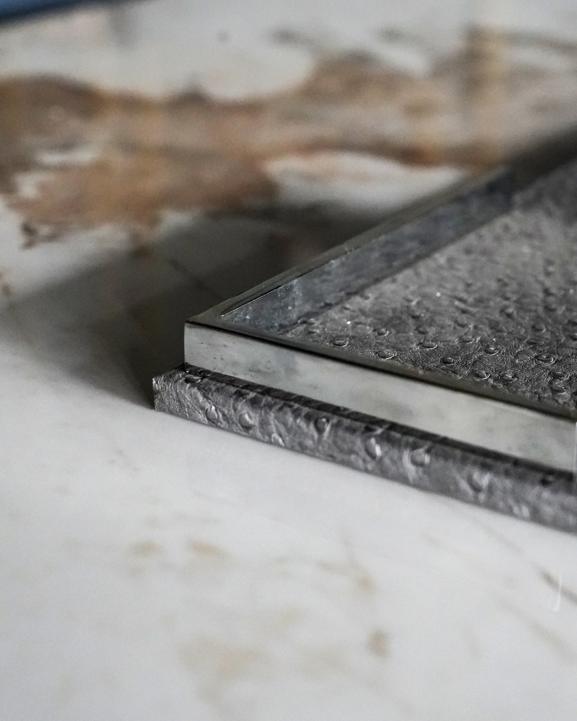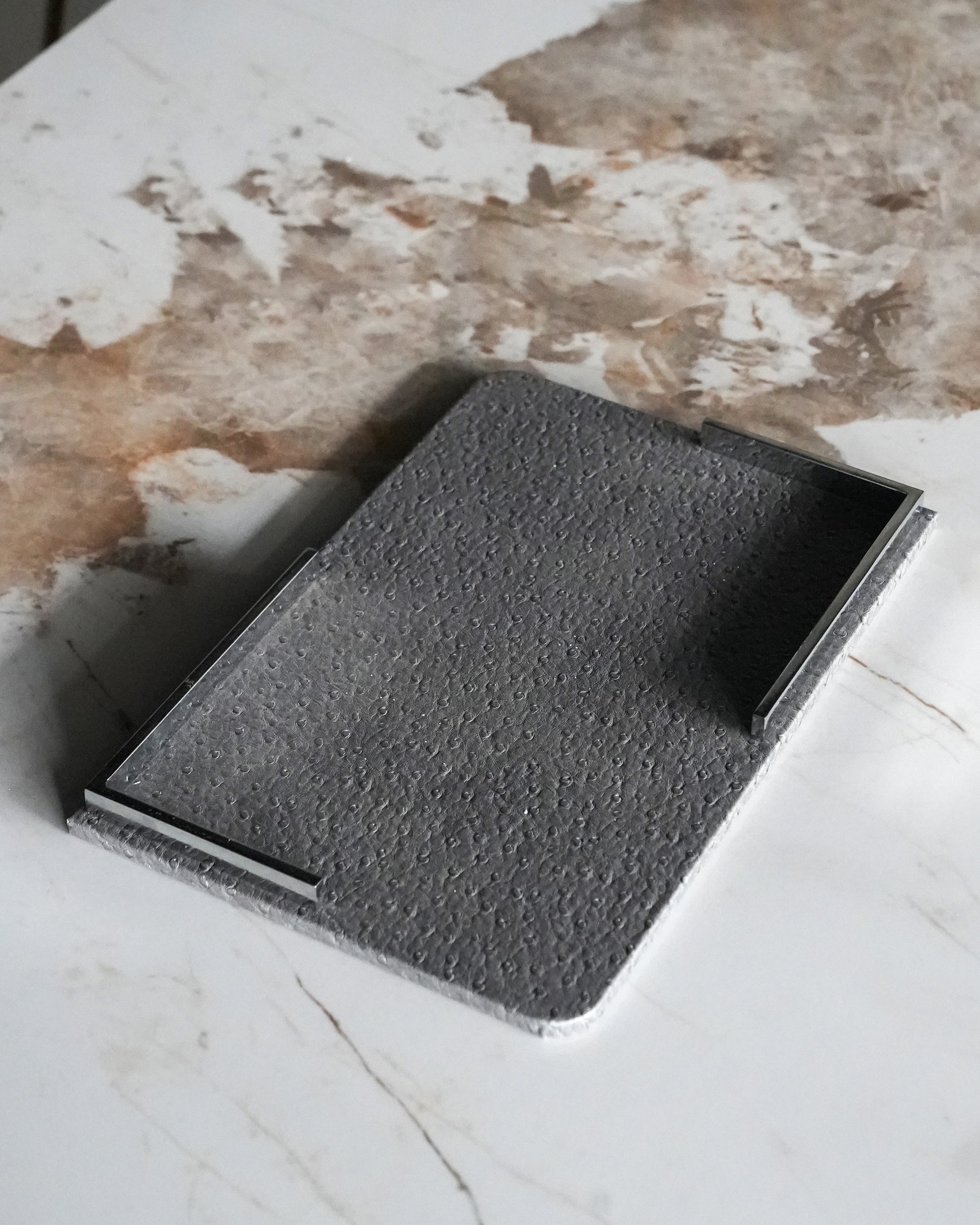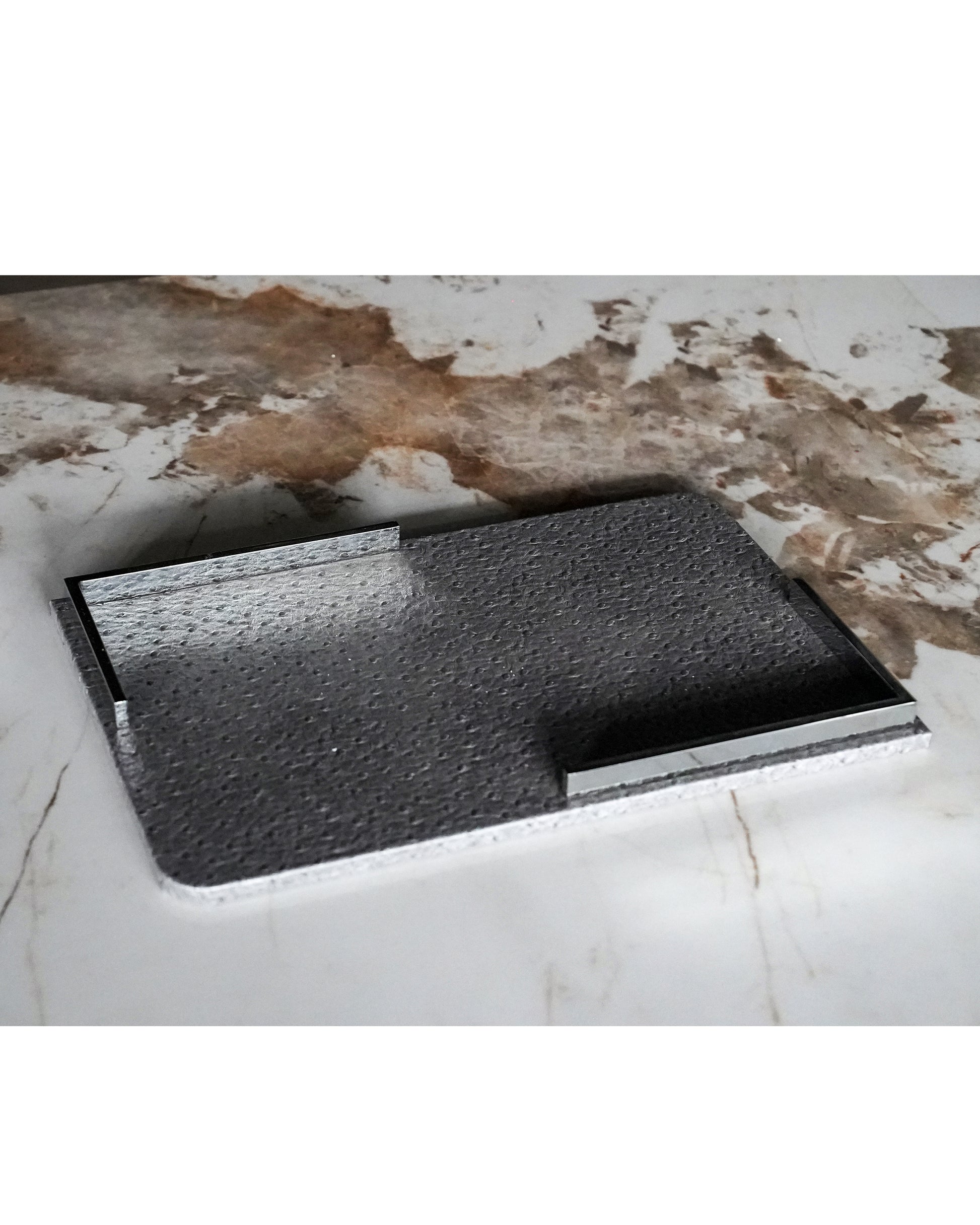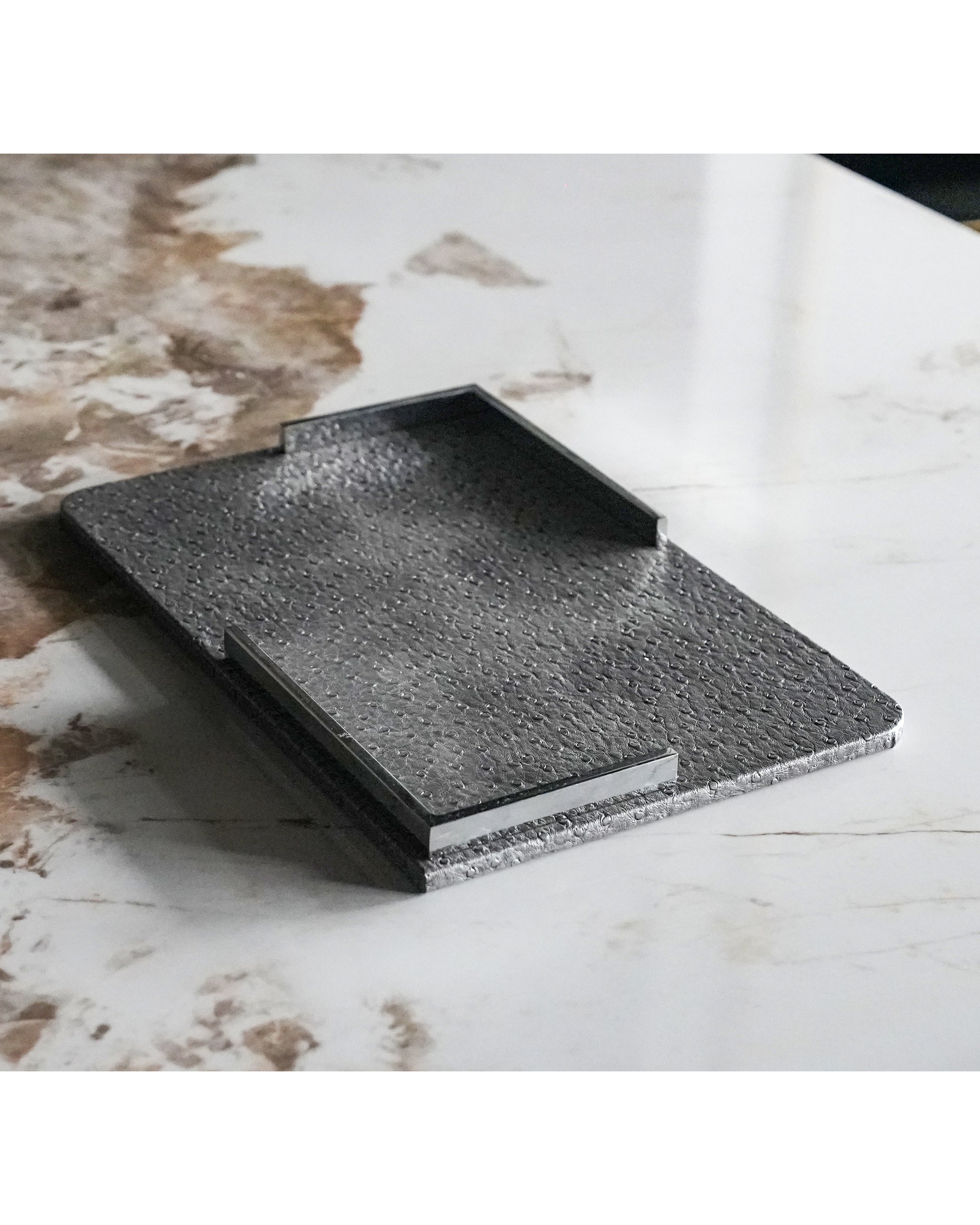 Crafted from sturdy metal in an elegant dark silver hue, this long tray measures 350 × 230 × 25 mm—perfectly proportioned for serving, organizing, or styling accents. The slim, rectangular design brings clean lines and modern flair to coffee tables, sideboards, or kitchen counters. Lightweight yet durable, it's both functional and decorative. Ideal as a serving tray or as a base for candles, vases, or daily essentials, it adapts effortlessly to contemporary interiors and minimalist décor schemes.