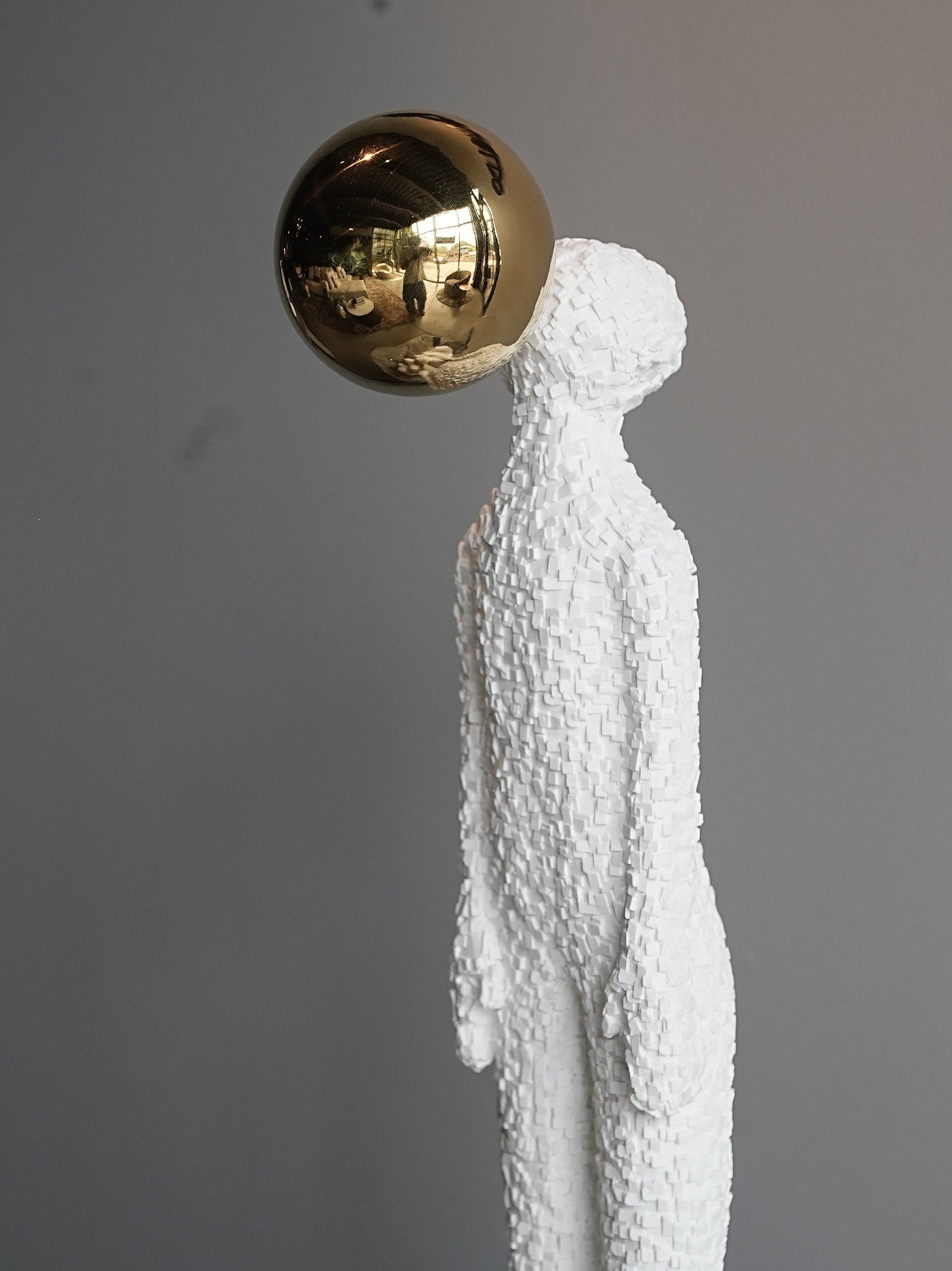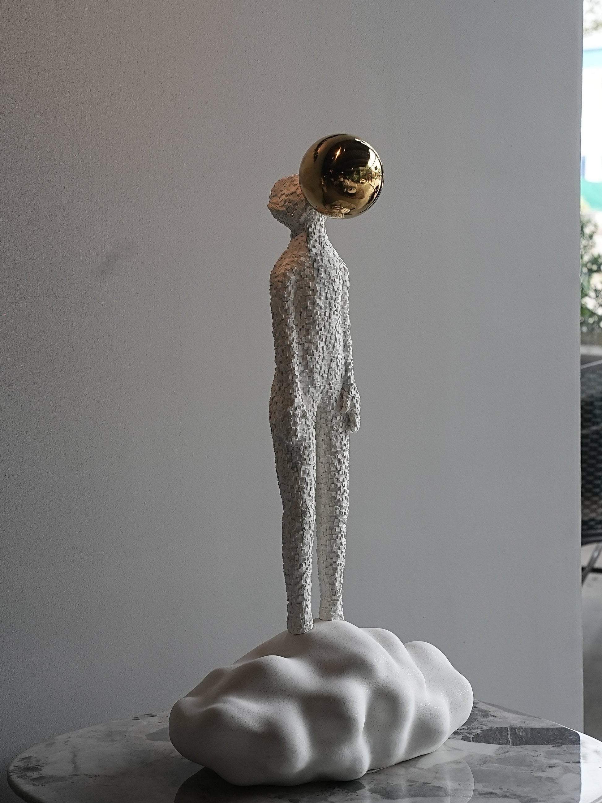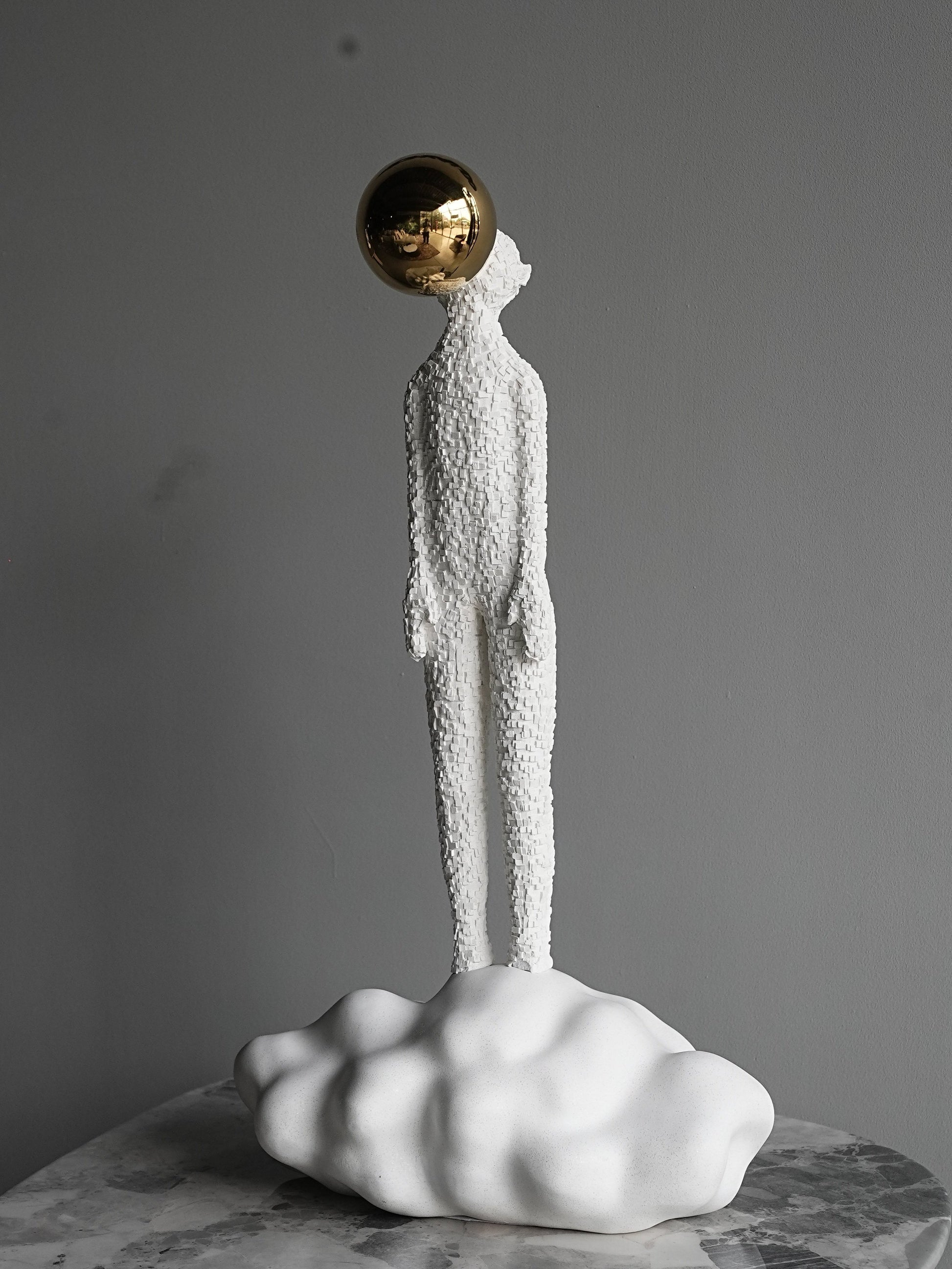 A white resin sculpture of a man above the clouds, representing freedom. This striking white resin sculpture depicts a man rising gracefully above the clouds, symbolizing limitless freedom and aspiration.