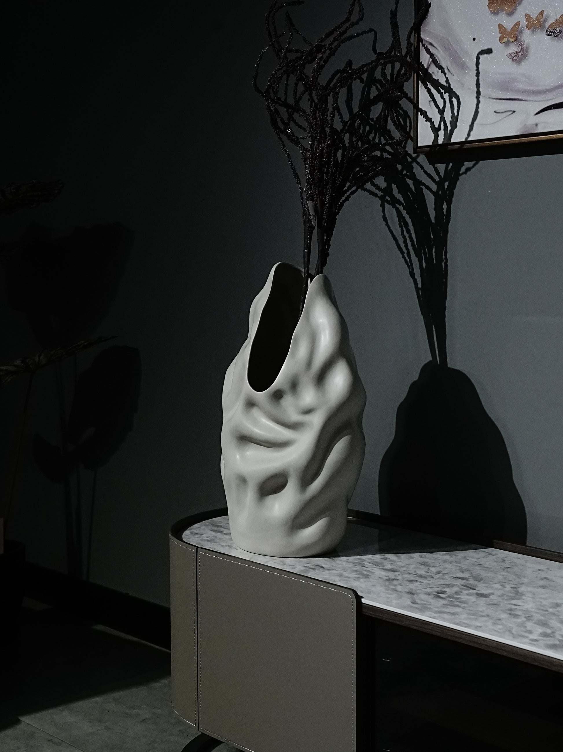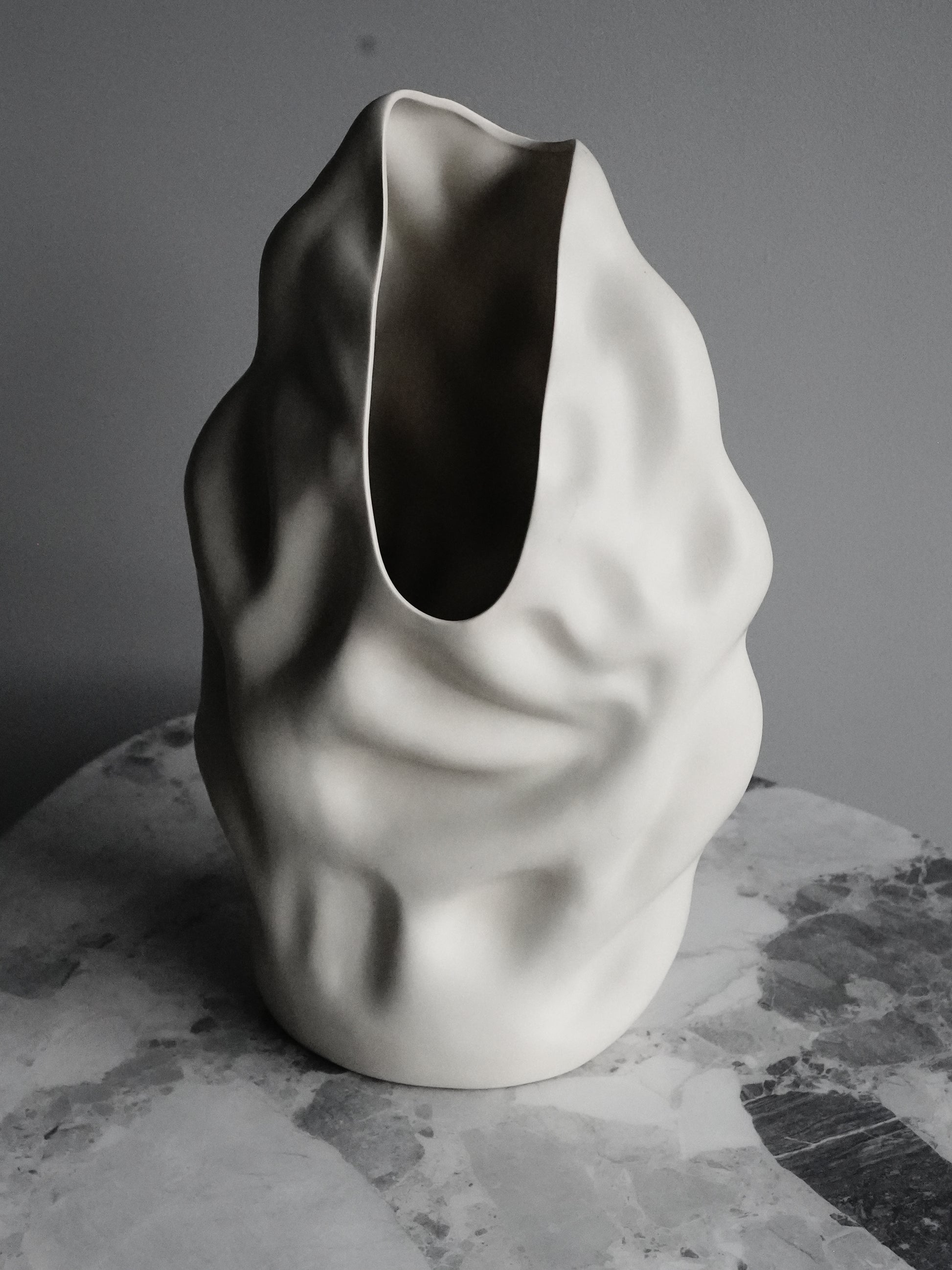 This stylish ceramic vase boasts a graceful, flowing shape that exudes sophistication, while its lustrous glaze captures and reflects light to reveal subtle depth and color variations. Perfect as a standalone statement piece or paired with fresh or dried flowers, it effortlessly enhances any room’s ambiance with its artistic elegance.