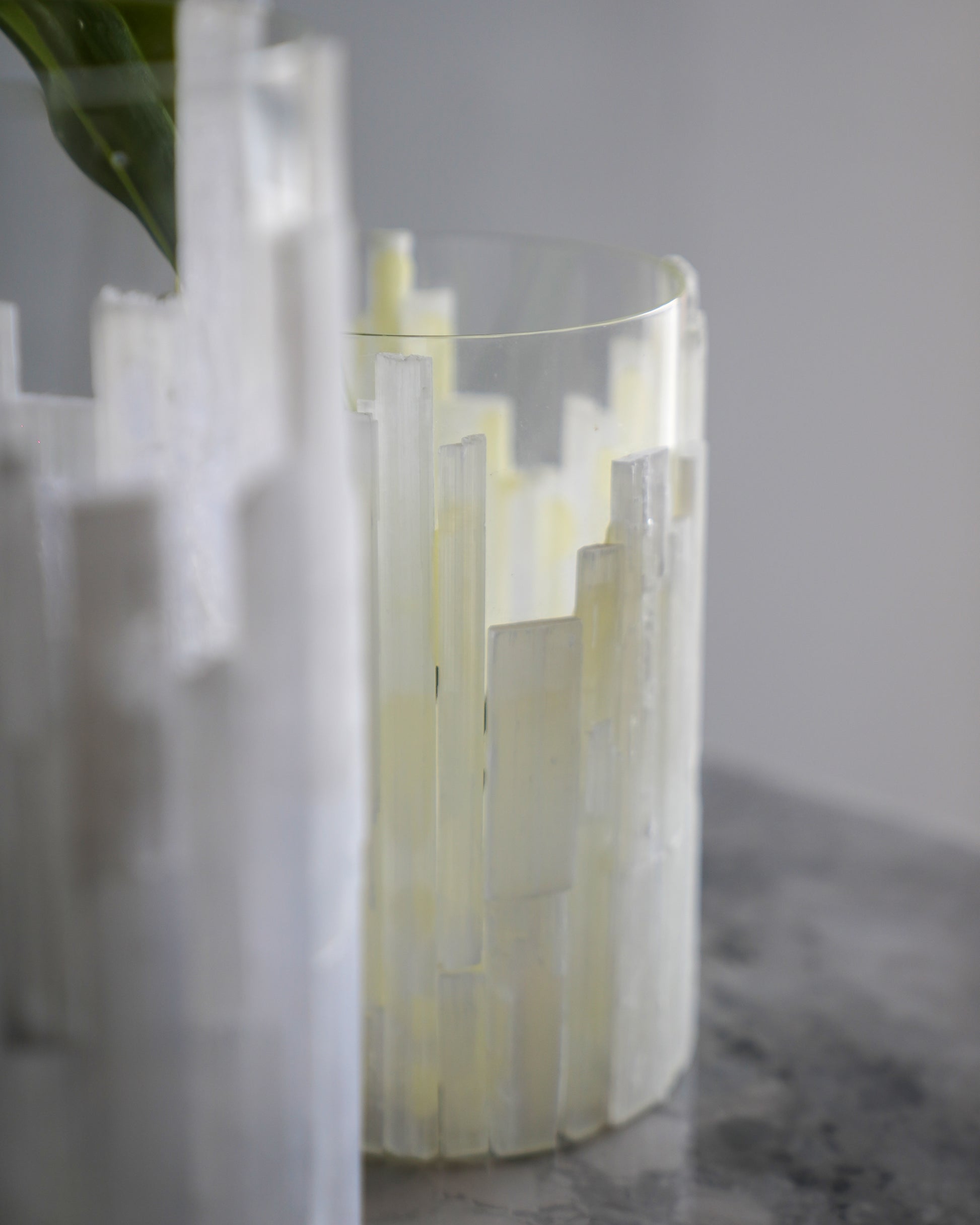 A delicate glass vase with a sleek, modern design, perfect for showcasing flowers or as a standalone piece. Featuring a textured finish and premium craftsmanship, this ornament adds elegance and visual intrigue to your living room, bedroom, or entryway. An ideal centerpiece or complement to your existing décor pieces.